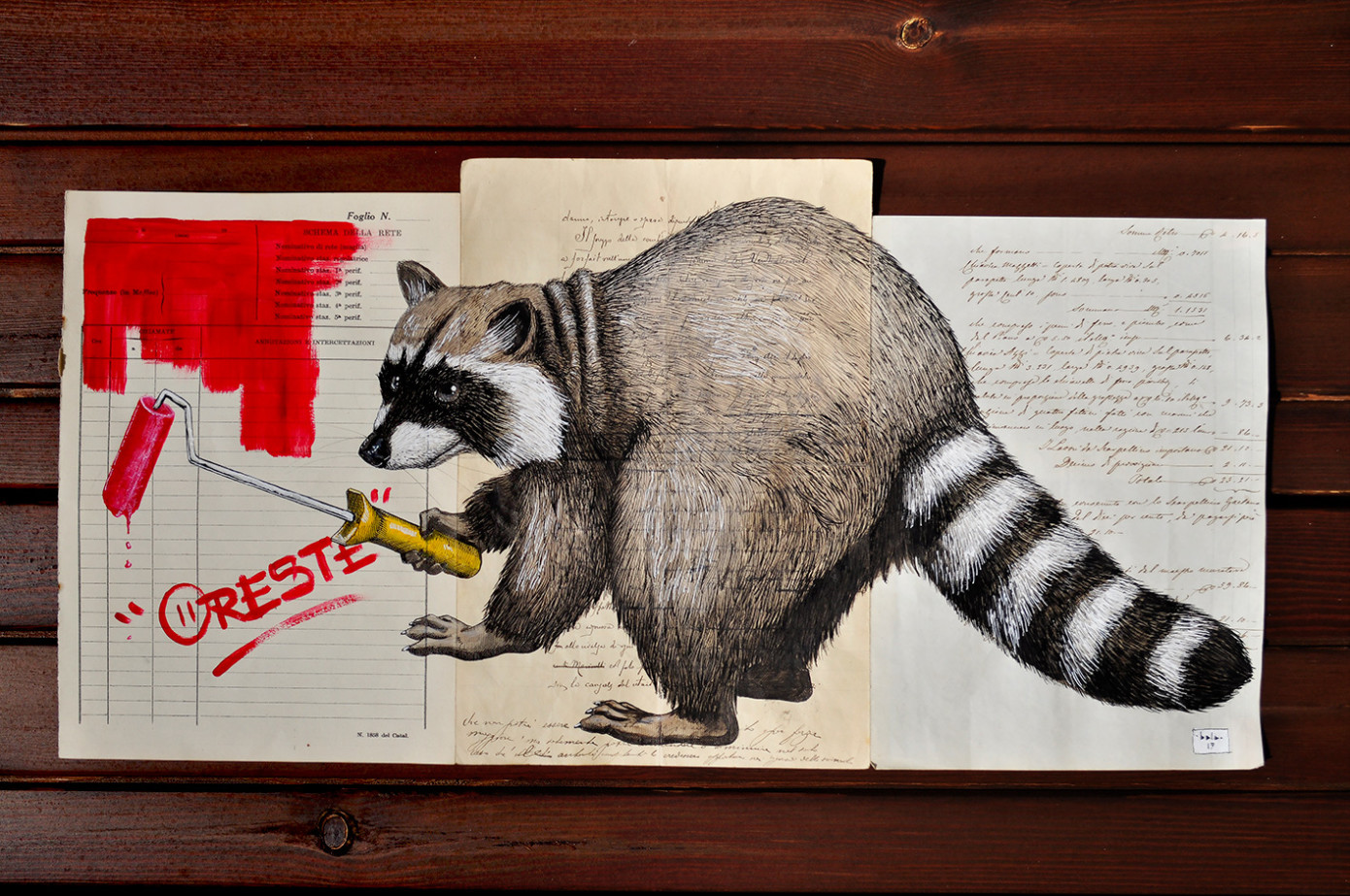 “Nasco nel 1978 a Ferrara – città nella quale vivo e creo – e sono membro del collettivo artistico Vida Krei (VKB). Scarabocchio da sempre ma, dopo alcuni anni di stop totale a causa degli studi universitari in Ingegneria Elettronica e al lavoro come 3d graphic designer, nel 2008 inizio a (provare a) dipingere. Nel 2010 arrivano i primi premi e mostre personali. Da sempre incline ad annoiarmi sento la continua necessità di evolvere il mio linguaggio ed esplorare nuovi temi. Pure correndo il rischio di non trovare più riscontro non posso fare a meno di assecondarmi. È così che, dopo aver creato il mio alter-ego “Sfiggy” ed essermi raccontato per suo tramite, sono arrivato al progetto [R]EVOLVE[R], passando attraverso le serie “Fuori Orientamento” e “Di treni, scambi e passaggi a livello”, nelle quali forse stavo metabolizzando i cambiamenti per trovare una nuova strada. Sono curioso per natura e sempre aperto al confronto ed alla contaminazione di culture e stili e questo si riflette sia sulle opere “da galleria” che sui lavori murali che ho realizzo in tutta Italia e all’estero. Sono ad oggi rappresentato da diverse galleria in Italia, USA e Portogallo, partecipo a Festival ed eventi legati alla Street-Art ma continuo a trovare che uscire con un secchio pieno di vernice e qualche spray e farsi una giornata in giro con gli amici a disegnare su di un muro sia la cosa più bella del mondo”