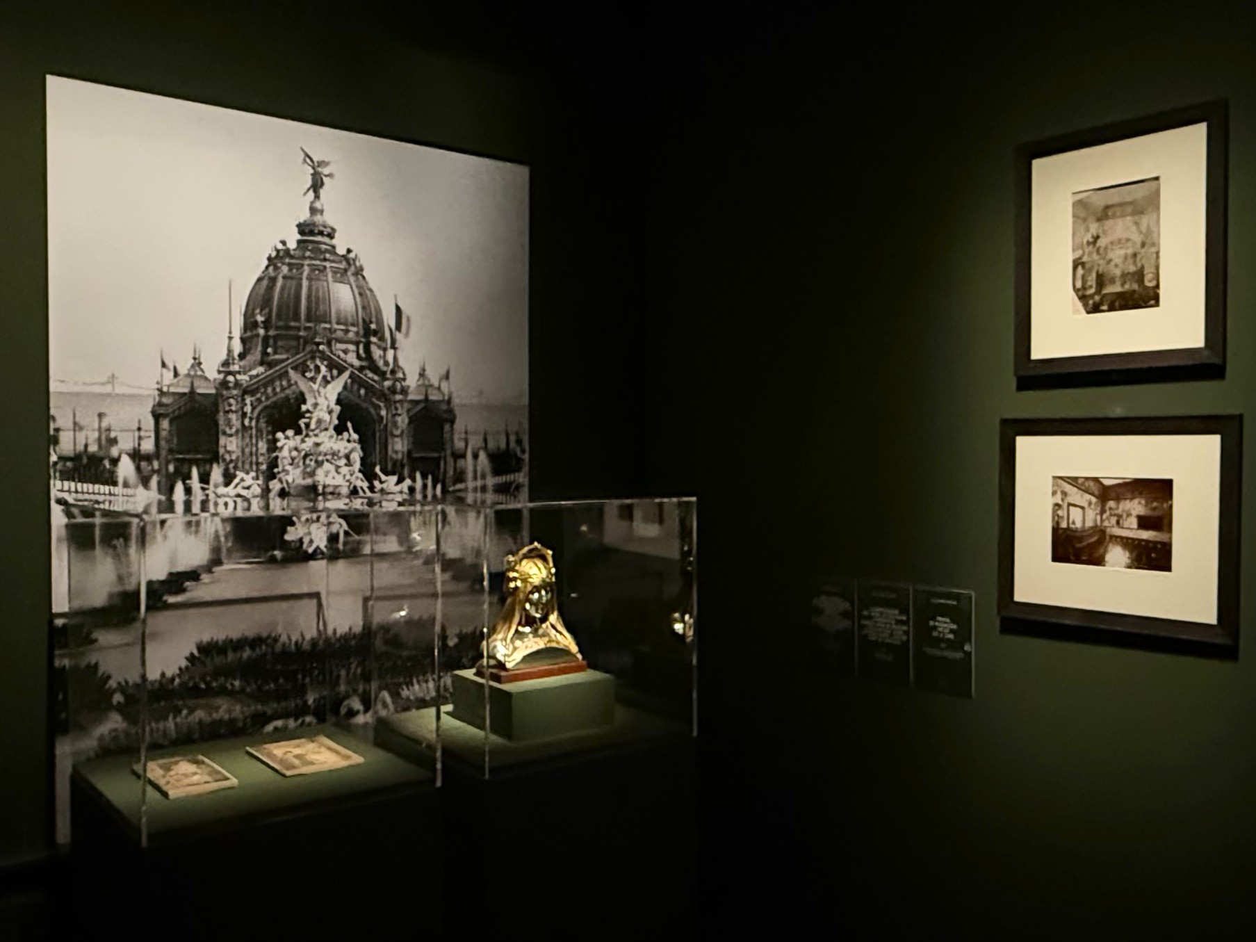 In mostra non manca il dialogo visuale con arredi Art Nouveau, oggetti decorativi e fotografie d’epoca: ogni pezzo concorre a costruire un racconto estetico e simbolico, dove il femminile, la natura, il mito e l’ideale si incontrano.