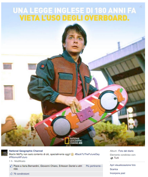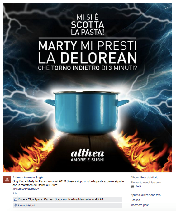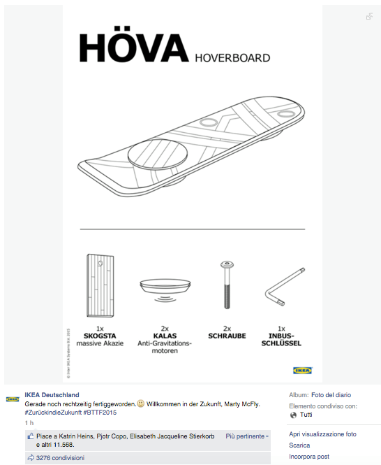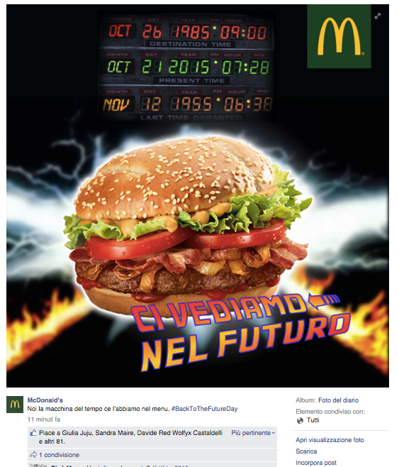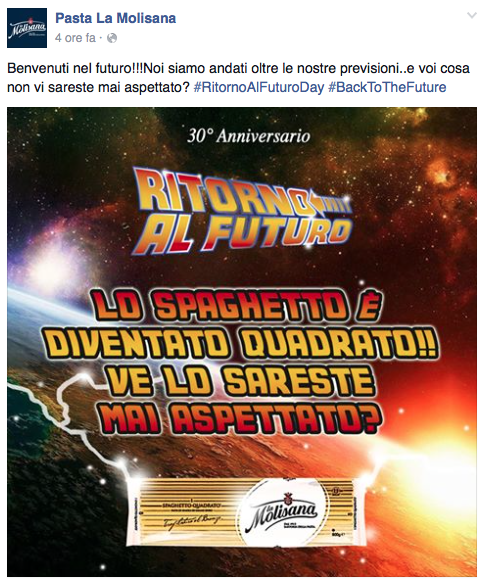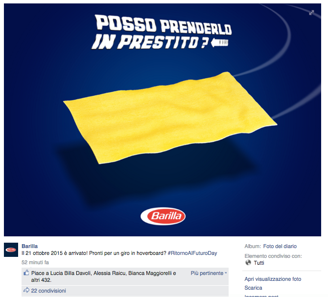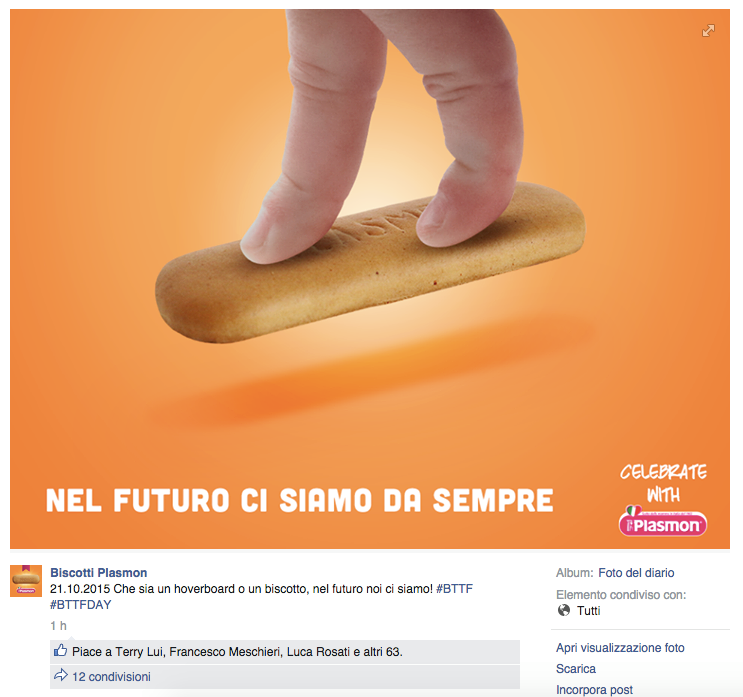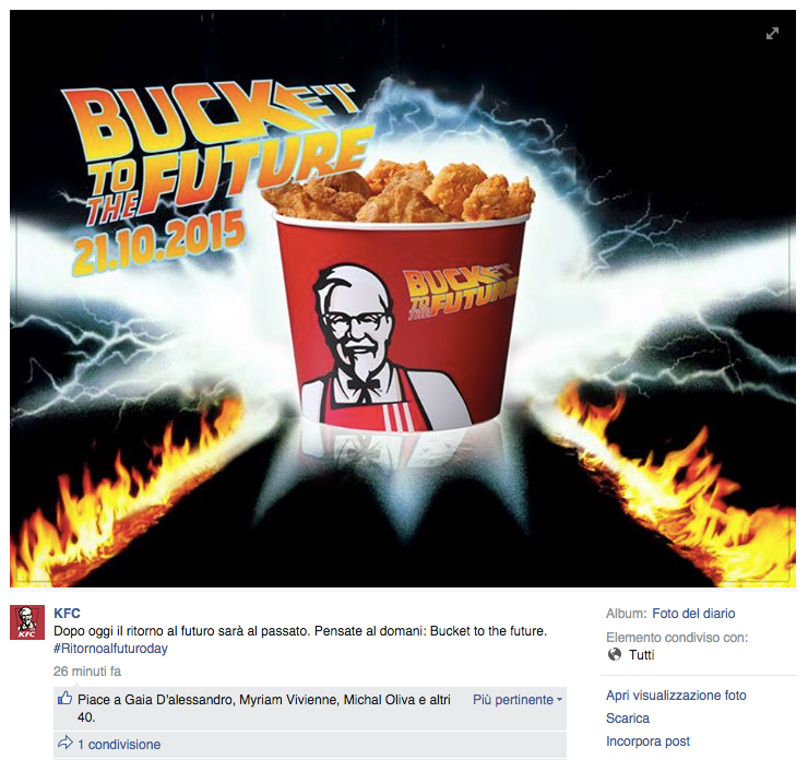 Noi di ViviCreativo vogliamo mostrarvi come i brand si sono comportati oggi, in molti si sono esposti sui social con immagini divertenti e create ad hoc per questa giornata di ritorno al futuro, attraverso vere e proprie operazioni di real time marketing. In tanti hanno voluto utilizzare l’hoverboard come protagonista, paragonando i loro prodotti al famoso skateboard volante, in questo senso è il caso di citare Plasmon, Ikea e Barilla. Con un gioco di lettere KFC propone il suo “Bucket to the Future” pieno di bocconcini di pollo fritto. Il brand Althea vorrebbe una macchina del tempo per tornare indietro di qualche minuto e non scuocere la pasta. Anche Groupon utilizza la DeLorean per proporre una delle sue offerte. Anche noi abbiamo voluto celebrare il Back to the Future Day con un’immagine, cosa ne pensate?