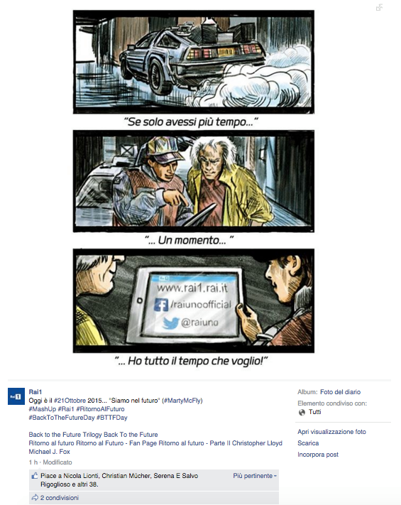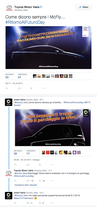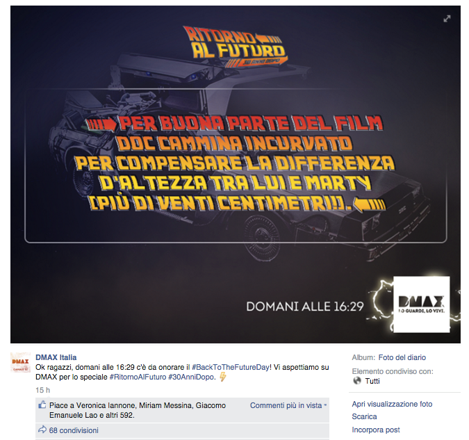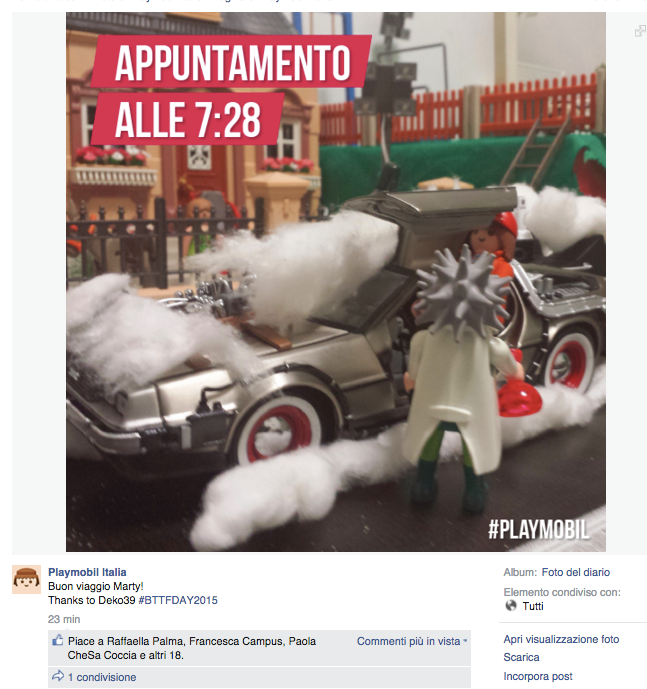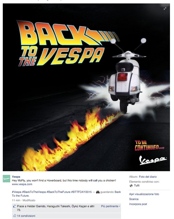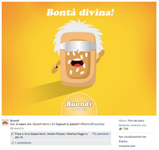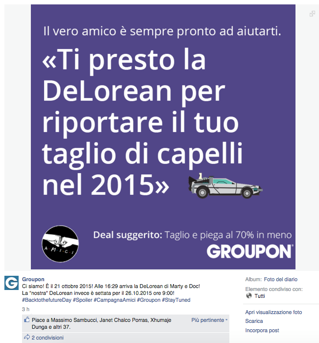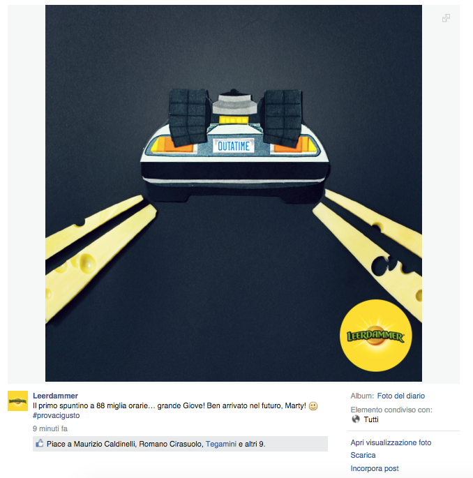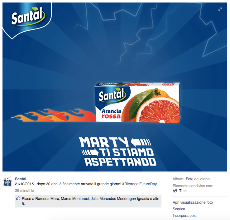 Noi di ViviCreativo vogliamo mostrarvi come i brand si sono comportati oggi, in molti si sono esposti sui social con immagini divertenti e create ad hoc per questa giornata di ritorno al futuro, attraverso vere e proprie operazioni di real time marketing. In tanti hanno voluto utilizzare l’hoverboard come protagonista, paragonando i loro prodotti al famoso skateboard volante, in questo senso è il caso di citare Plasmon, Ikea e Barilla. Con un gioco di lettere KFC propone il suo “Bucket to the Future” pieno di bocconcini di pollo fritto. Il brand Althea vorrebbe una macchina del tempo per tornare indietro di qualche minuto e non scuocere la pasta. Anche Groupon utilizza la DeLorean per proporre una delle sue offerte. Anche noi abbiamo voluto celebrare il Back to the Future Day con un’immagine, cosa ne pensate?