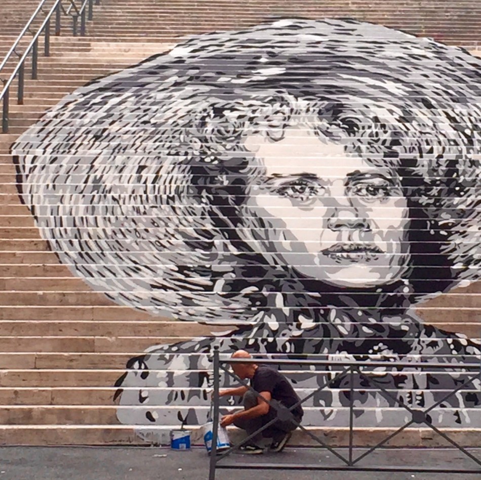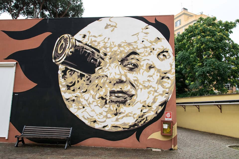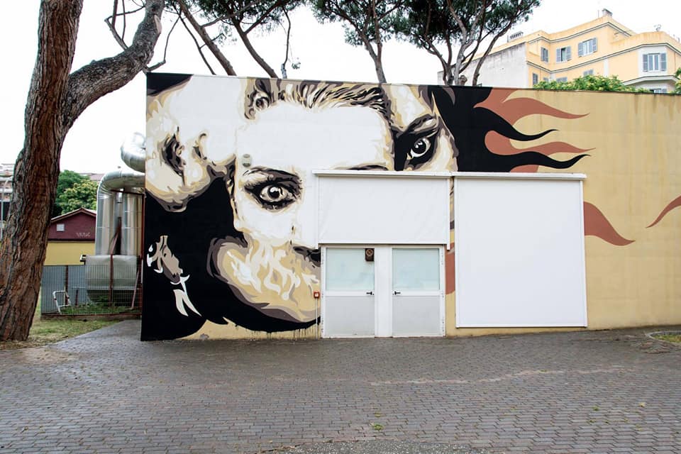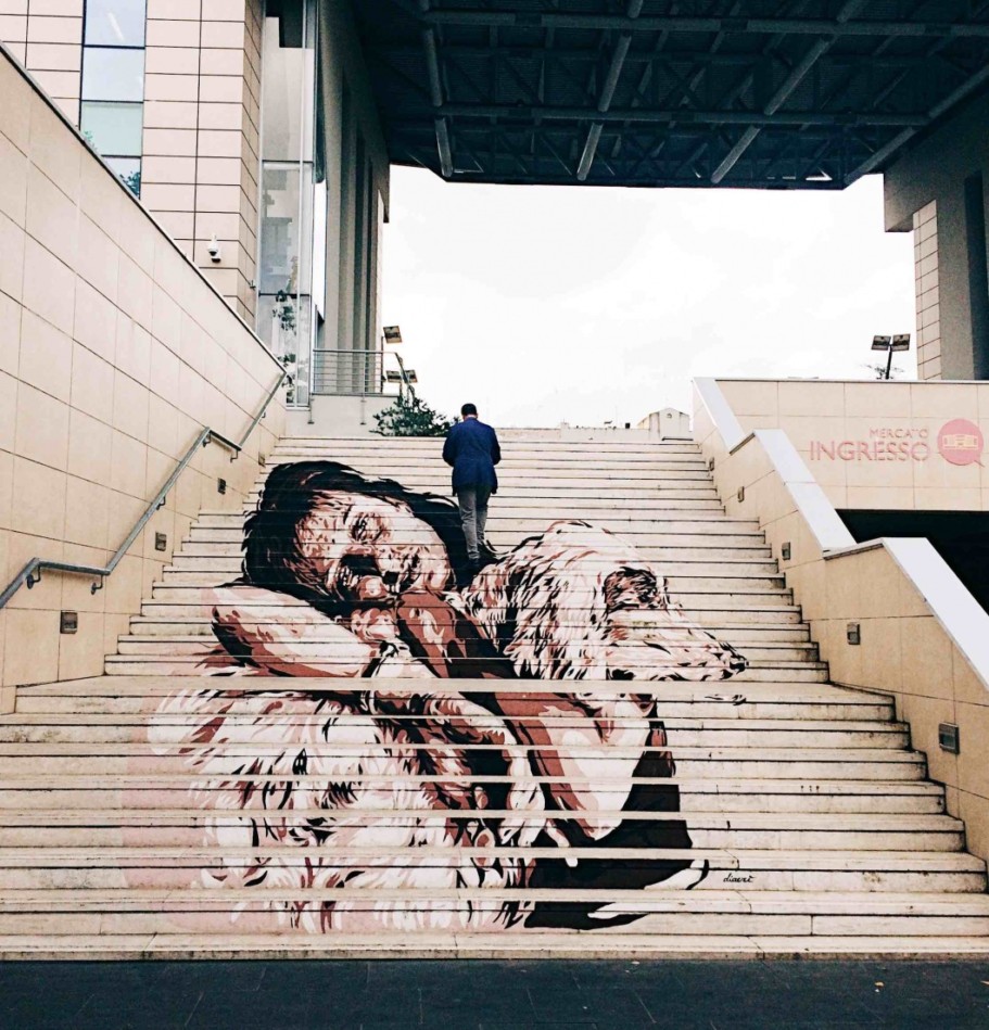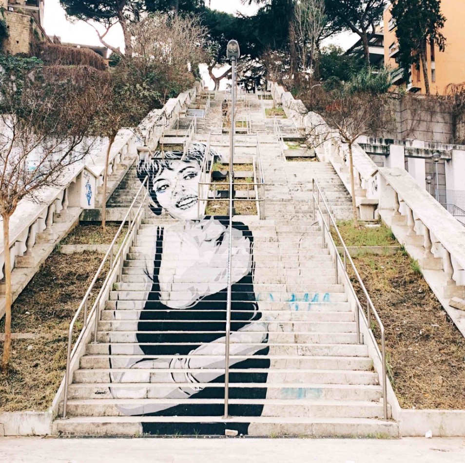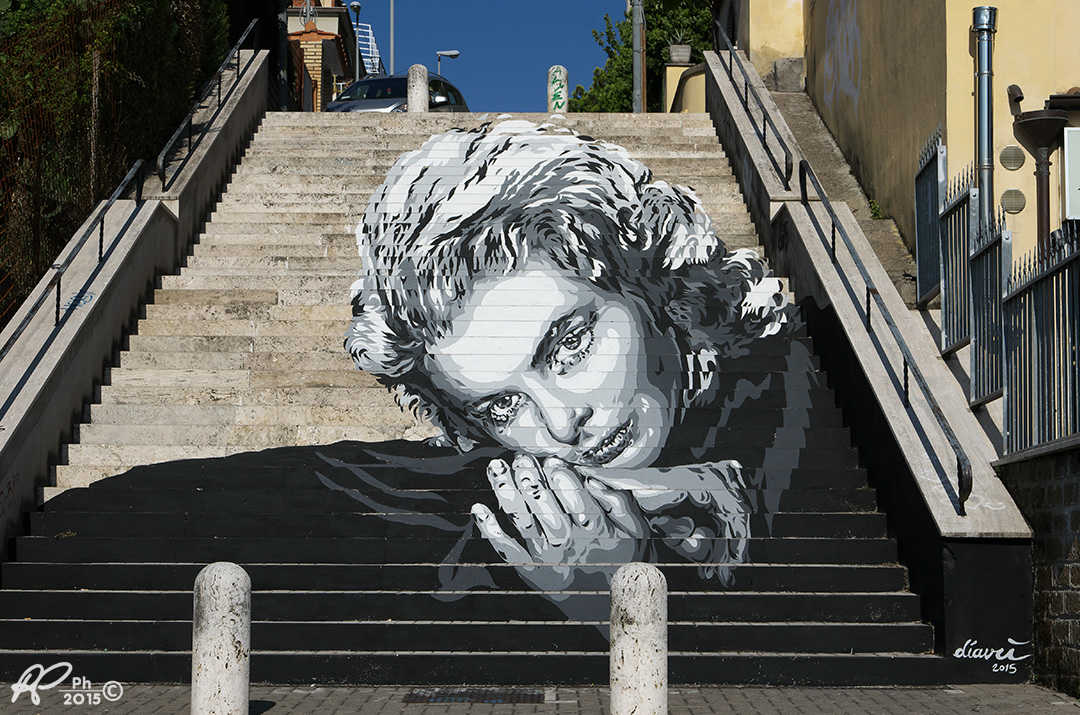 Posso dirti che quando frequentavo ancora all’Istituto d’Arte sono andato ad aspettare Federico Fellini sotto casa finché non sono riuscito a conoscerlo, ho inseguito Nanni Loy in metropolitana e ne ho combinate altre di questo genere, proprio per la grande passione che nutrivo nei confronti di questo linguaggio e di alcuni dei suoi autori. Da amante del disegno, dei libri e della musica per me il Cinema – e idem il Cinema d’animazione – è sempre stato un linguaggio attraente forse proprio per la sua peculiarità di utilizzare testo, immagine e suono. A un certo punto ho iniziato a utilizzare nelle mie opere d’arte urbana alcune immagini e personaggi tratti da film perché è un buon mezzo per parlare al cuore delle persone. Se il senso della tua opera puoi esprimerlo con un volto di un’attrice o un fotogramma reinterpetati da te, perché non farlo? Ad esempio col progetto Popstairs delle scalinate dipinte ho voluto esprimere l’esigenza di vedere più monumenti ‘al femminile’ nelle nostre città. Esprimere questo desiderio attraverso sguardi di attrici che ti osservano da quelle scalinate mi è sembrato del tutto naturale.