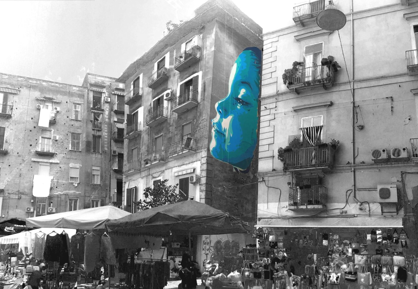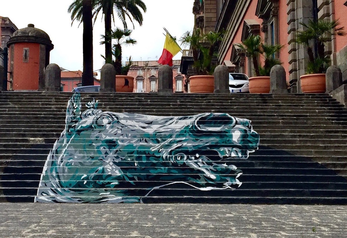 Il processo dell’ispirazione è complesso, a volte ti viene in mente l’immagine inaspettatamente e ti devi sbrigare a schizzarla sullo sketchbook prima che la dimentichi, altre volte sei tu a stimolare un’immagine perché il concept ti frulla in testa da un po’ e devi trovare assolutamente il modo migliore per esprimerlo. I soggetti veri e propri che dipingerò arrivano dopo questa prima fase di solito, e richiedono spesso sedute fotografiche in studio con modelli e la realizzazione di diversi bozzetti. Questo accade a meno che non si stia parlando di opere di Street Art o comunque realizzate in spazi condivisi e all’aperto che mi fanno venire in mente subito il soggetto. Ad esempio la testa di cavallo di Donatello che ho reinterpretato sulla scalinata di ingresso laterale del Museo Archeologico Nazionale di Napoli, è stato il primo soggetto che mi è saltato in mente appena visitato il museo. Così come quando vedo un luogo abbandonato fatiscente mi viene in mente che potrei dipingerci il Totòbolik, il mio mix tra Totò e Diabolik che rappresenta per me la potenziale speculazione che può facilmente verificarsi in quei luoghi, soprattutto se ignorati, ed è stata la scena di Totò che raggira un turista ignaro (e ignorante) vendendogli la Fontana di Trevi in “Totò Truffa” a ispirarmi quel personaggio.