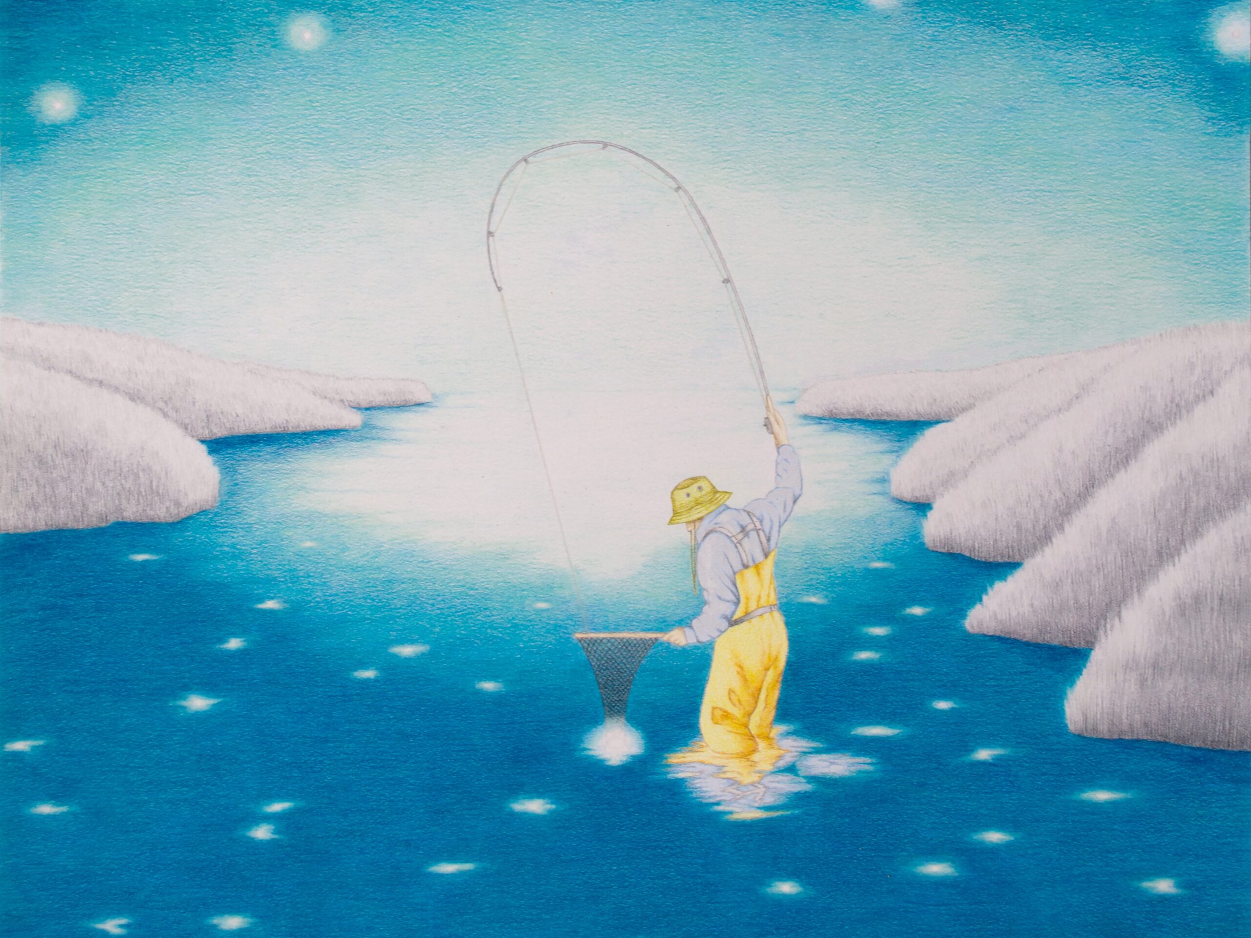 Maxime Verdier, particolare, La pesca miracolosa, 2025, matite colorate su carta, 42 x 35 cm. Cortesia dell’artista e della Galerie Anne-Sarah Bénichou.