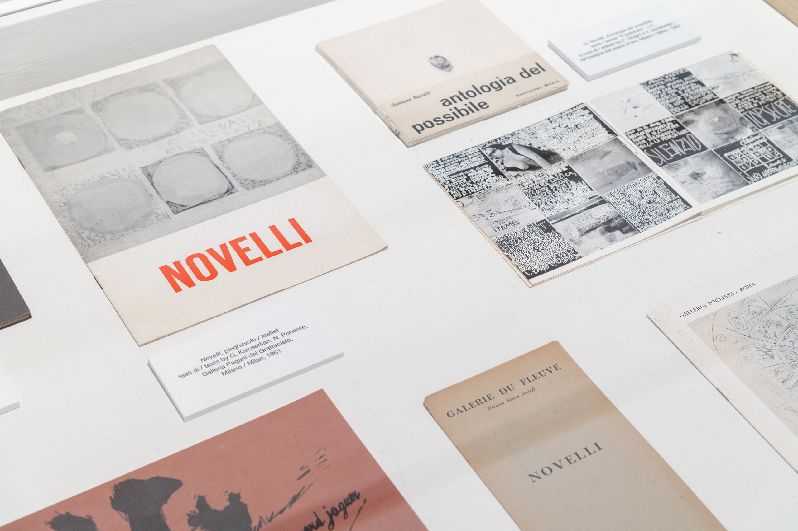 Il percorso, articolato in otto sale al secondo piano del museo, raccoglie circa sessanta opere e pone l’accento sul periodo più intenso di Novelli, dal 1957 al 1968. Si parte dalle opere informali degli anni Cinquanta, in cui il gesto materico e l’introduzione della scrittura come segno visivo diventano cifra poetica, fino ai lavori finali in cui parola e azione si caricano di significato etico e politico.