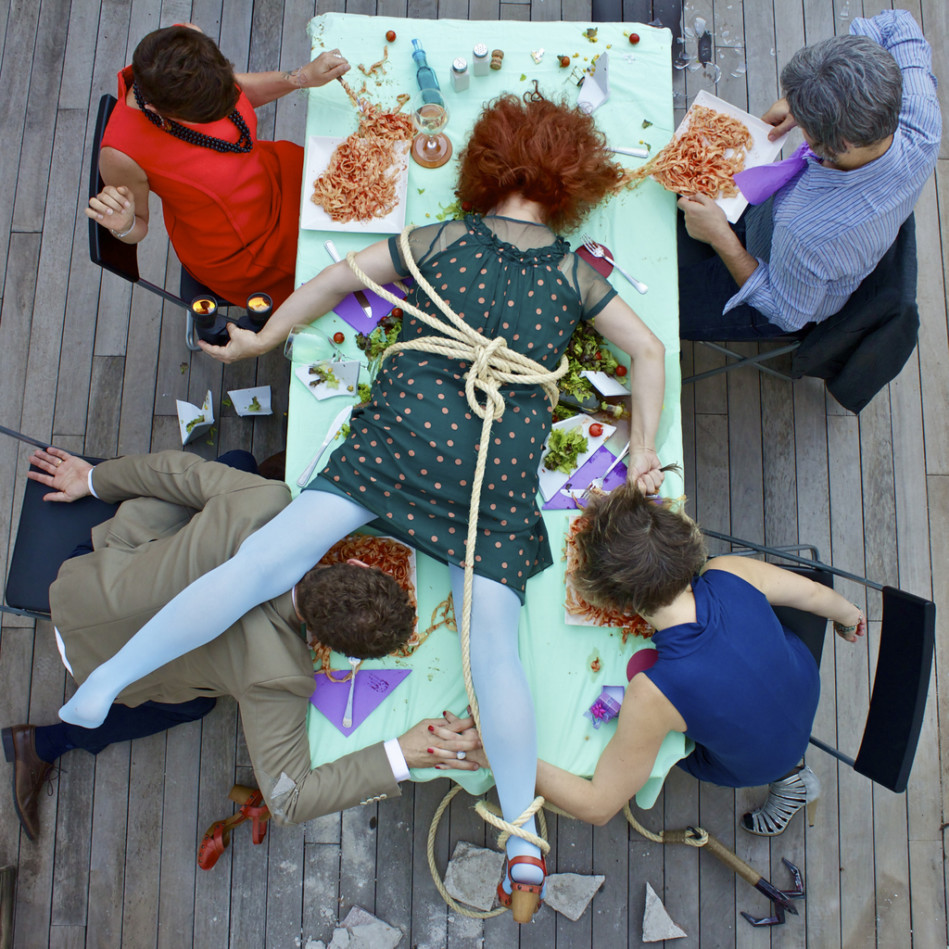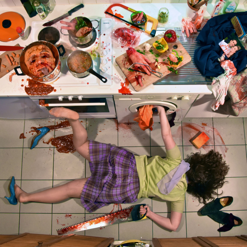Dipende dalle foto. Alcune le penso e realizzo in pochissimi giorni, ma la maggior parte di loro richiede un tempo che va dalle tre alle quattro settimane di preparazione. Per prima cosa, trovare la giusta location, e questo diventa sempre più difficile. Faccio un po’ di foto a quello che sarà “il luogo del delitto” e poi me le studio sul computer per diversi giorni, immaginando la posizione del corpo, la disposizione degli oggetti e i colori che voglio inserire. Mi metto quindi alla ricerca del materiale di cui ho bisogno, compresi i vestiti e gli accessori, chiamo modelli e assistenti, decido il giorno dello shooting e si comincia. Poi c’è tutta la fase di post produzione, che spesso dura circa altre tre settimane. Consiste nel regolare luminosità, contrasti e colori, e fare qualche piccolo ritocco a Photoshop.