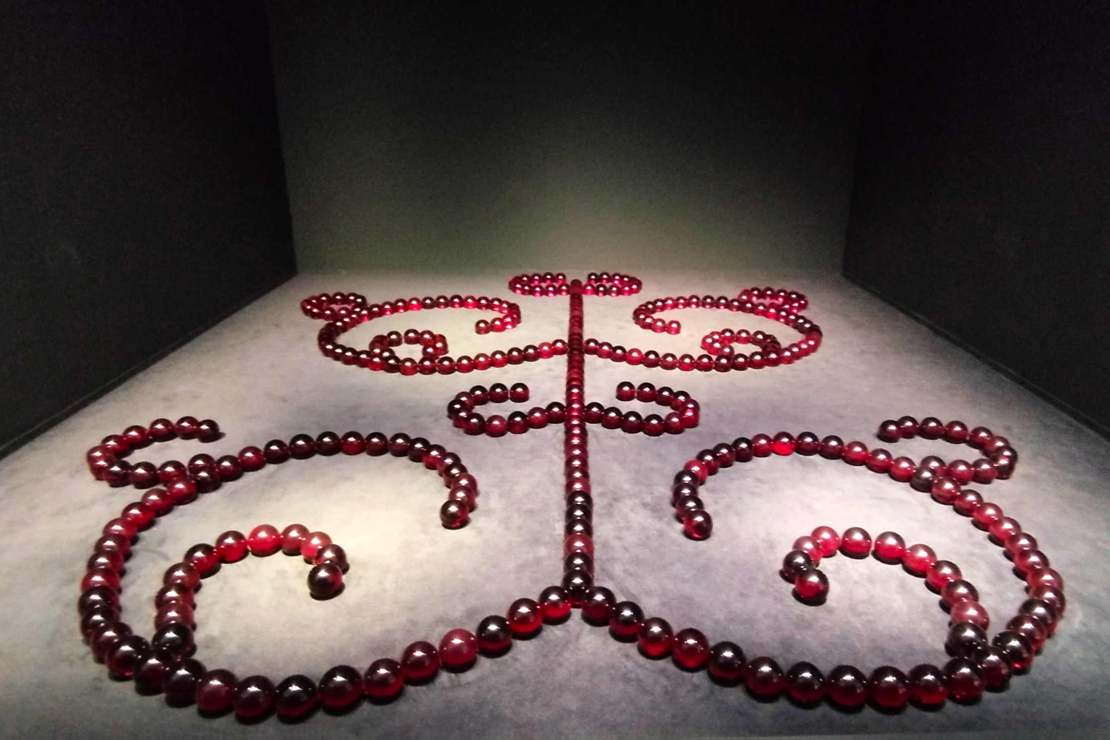 Il percorso della mostra termina con l’opera di James Lee Byars che firma uno dei capolavori più enigmatici del Cirva: Le Petit Ange Rouge. Trecentotrentatré sfere di vetro perfettamente identiche disegnano un arabesco ipnotico, animate da un rosso profondo, il celebre “rosso veneziano”, tonalità rara, quasi mistica, tramandata da un maestro delle fornaci lagunari. È proprio a Venezia che l’artista americano, ossessionato dalla perfezione e dal mistero, concepisce questa opera come un enigma di luce. Il suo titolo rimane indecifrabile — come ogni domanda che non pretende risposta. Per Byars, la sfera è la forma stessa dell’interrogativo: pura, assoluta, eterna. Le Petit Ange Rouge non si spiega, si contempla — fluttuante, sublime, inafferrabile come un pensiero sospeso tra cielo e fuoco.