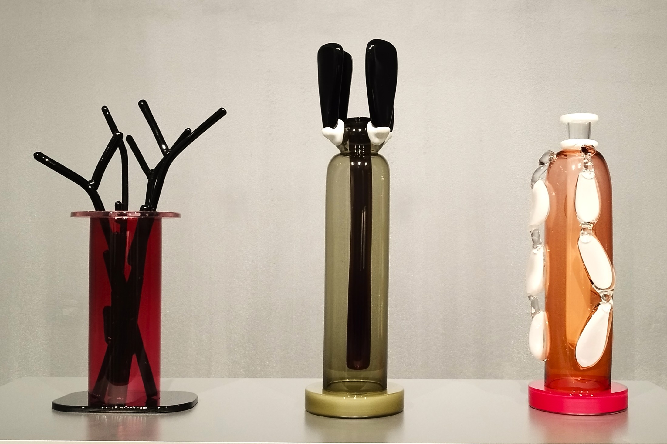 L’esposizione attraversa le molte anime del vetro celebrando il dialogo tra arte, design e sperimentazione tecnica: da Ettore Sottsass con i suoi Lingam e Kachina, ai vasi visionari di Betty Woodman, la serie dei Concepts di Bob Wilson, L’unghia di Giuseppe Penone, il suggestivo Planetarium di Jana Sterbak, la serie Torno Subito di Pierre Charpin, gli Occhi-seme di Mathilde Rosier, dall’estetica kitsch di Richard Di Rosa al poetico Petit Ange rouge de Marseille di James Lee Byars.