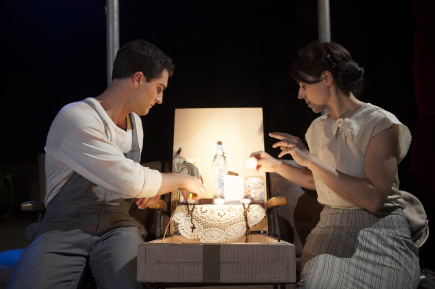 Quando ci commissionano un lavoro con una sceneggiatura da leggere iniziamo spesso separati. Ognuno legge il proprio copione e costruisce mentalmente un’idea di scene e luci. Questo è il momento più lungo di tutta la progettazione, perché abbiamo bisogno di svolgerlo con metodi e tempi diversi; il farlo inizialmente separati ci dà la possibilità di trovare direzioni diverse e non contaminate. Dopo si elaborano e si miscelano. Si capiscono. Qui si inserisce uno dei frangenti progettuali più coinvolgente e di per sé bello: qui abbiamo l’opportunità di giocare, di discutere le idee più strane, assurde, trattenendo le più audaci e dando loro corpo attraverso la ricerca della tecnica. Con essa, a questo punto, bisogna fare i conti con i pesi e le misure. È esattamente il luogo in cui si deve attraversare lo spazio che va dal pensabile al fattibile. Prendendo un caffè con la gravità e un tè con l’oggettività.