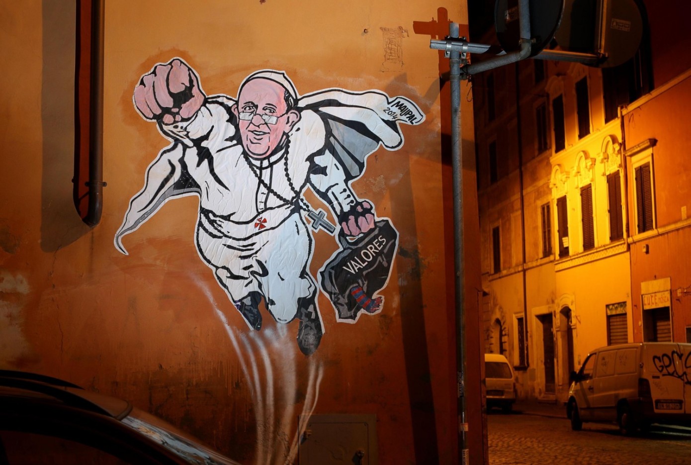 Il suo murale Super Pope, dedicato a Papa Francesco e realizzato a Borgo Pio, ha fatto molto parlare di lui. Lo street artist ha anche incontrato Papa Bergoglio e gli ha donato un dipinto che riproduce la sua opera: il Papa in vesti da super eroe.