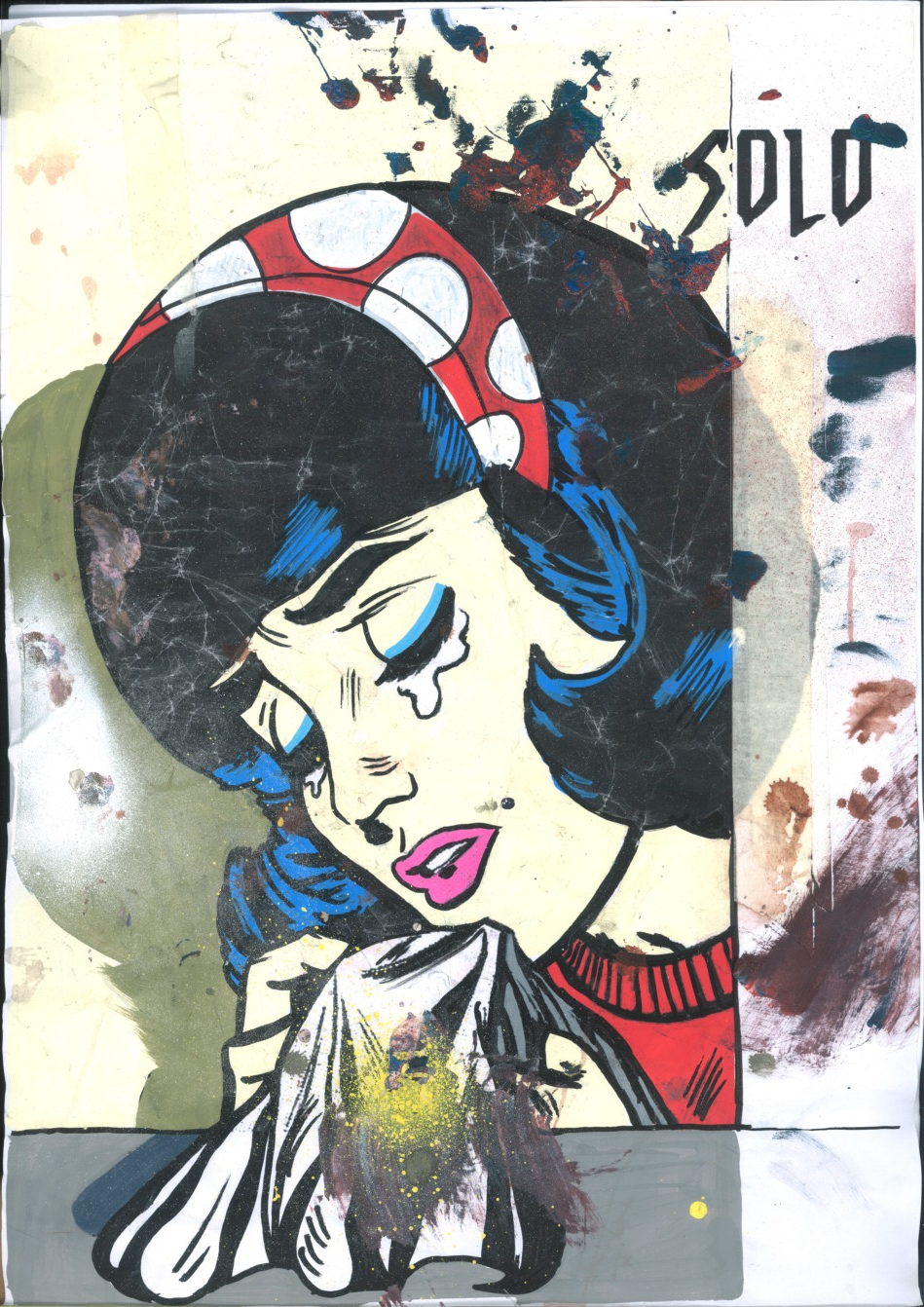 Solo nasce nel 1982 a Roma, dove vive e lavora. Nel 2002 si iscrive all’Accademia di Belle Arti di Roma dove scopre la sua predilezione per la figura rispetto allo “studio calligrafico” ed inizia il suo percorso classico su tela. Alle opere su tela, che vengono esposte in varie gallerie del mondo, affianca la sua produzione sui muri. E così, dalla mostra al Macro di Roma curata da Achille Bonito Oliva dal titolo “Tracks”, alle gallerie di Parigi, Praga, Berlino, Miami e Londra, dai muri di Prima Valle a Roma, ai poster nelle zone disagiate di Rio de Janeiro e Los Angeles. Nel 2015 organizza il “Festival Internazionale di Poesia e Street Art” nel suo quartiere di origine, il Trullo, a Roma, progetto fortunato che trova la sua realizzazione con l’aiuto di altre realtà artistiche sbocciate proprio fra quelle vie, come i “Poeti der Trullo” e i “Pittori Anonimi”. A Londra, sempre nel 2015, crea un progetto chiamato “Comics Parkour”, con il quale dissemina per la città vari murales di grandi dimensioni, come se fossero parte di un fumetto le cui pagine sono state disperse dal vento.Nel 2018 partecipa alla collettiva ART IS MONEY MONEY IS ART presso la galleria Rosso20sette di Roma, collettiva di 18 artisti fra i quali Wharol, Banksy, Haring, Dface, Beuys.