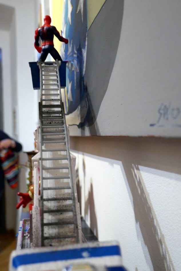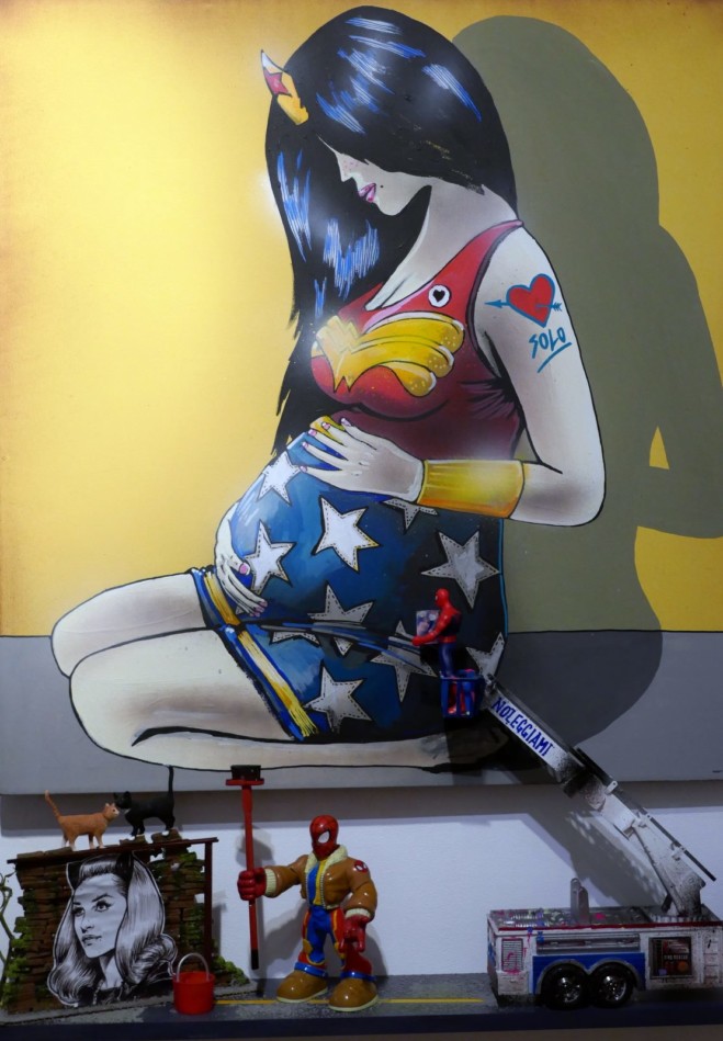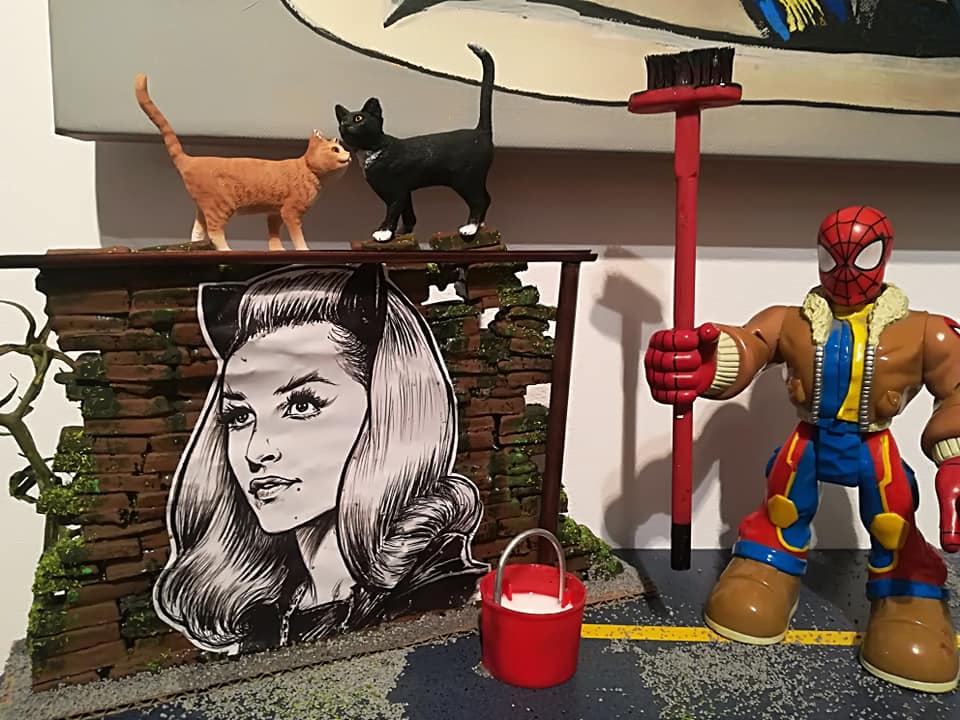 In più, per dare un valore aggiunto alla mostra, abbiamo costruito dei diorami, dei modellini. Ci siamo autoritratti con la plastilina, realizzando due mini sculture da piazzare nel cestello meccanico; abbiamo comprato due camioncini che utilizziamo noi per dipingere su muro, quelli con il braccio elevatore e li abbiamo riverniciati, ci siamo ricostruiti con la plastilina, abbiamo fatto due autoritratti e li abbiamo montati sotto la tela. La tela diventa così come un muro; al mio diorama io ho aggiunto un mini muro con tanto di mini poster incollato sopra, che raffigura Cat Woman e sul muro stesso passeggiano due gatti in scala con tutto il modellino. Io e Stefano ci siamo divertiti molto nel prepararli!