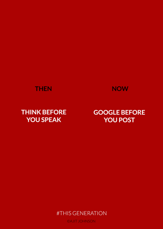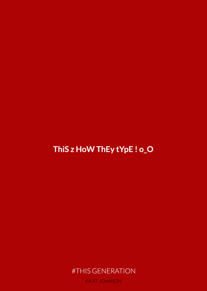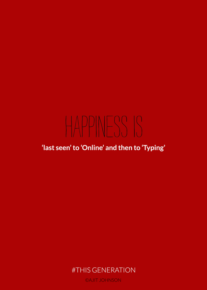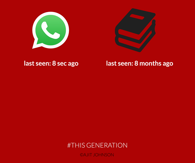 Con delle immagini molto semplici, sfondo rosso, pochissimo testo e immagini minimaliste, This Generation racconta il rapporto morboso che ormai molti teenager (ma non solo), hanno con la tecnologia: si va dalla differenza dell’ultima visita su WhatsApp (8 secondi fa) a quella dell’ultima lettura di un libro (8 mesi fa), a come ormai si vivono i rapporti (non ci si lascia davvero se non la/lo si blocca sui social), fino ad arrivare ai cambiamenti che ci sono nella scrittura e al cambiamento dei bisogni primari (è più importante avere il wifi invece dell’acqua).