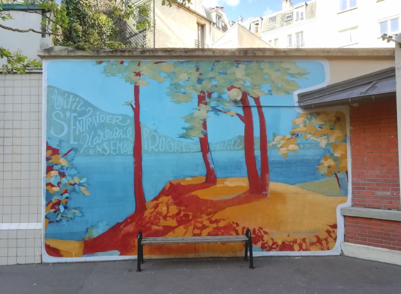 No, ho già lavorato molte volte nelle scuole, anche negli ospedali, nelle case famiglia o in altri istituti. Ho dipinto spesso anche con i bambini, mi piace moltissimo. In questo caso purtroppo non è stato possibile, perché la superficie non era abbastanza grande. Gli alunni hanno scelto peró il messaggio da comunicare: una serie di parole che si legge nell’orizzonte di un paesaggio : amicizia, aiutarsi, armonia, insieme, progresso, uguaglianza, felicità e a chiudere la frase: “Apprendre, c’est grandir” (imparare è crescere). I colori verde, sabbia e ocra del murale riprendono volutamente quelli del cortile della scuola, per essere in armonia con lo spazio.