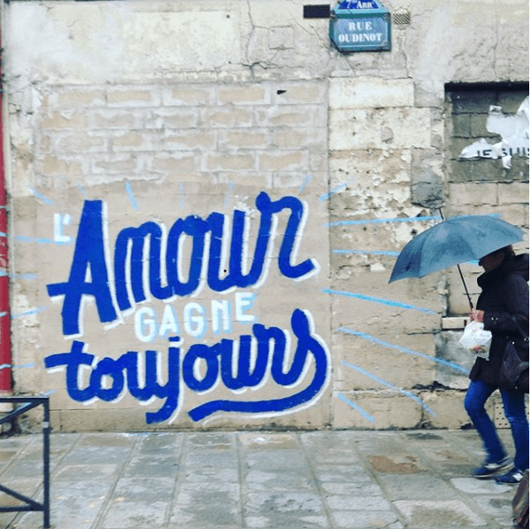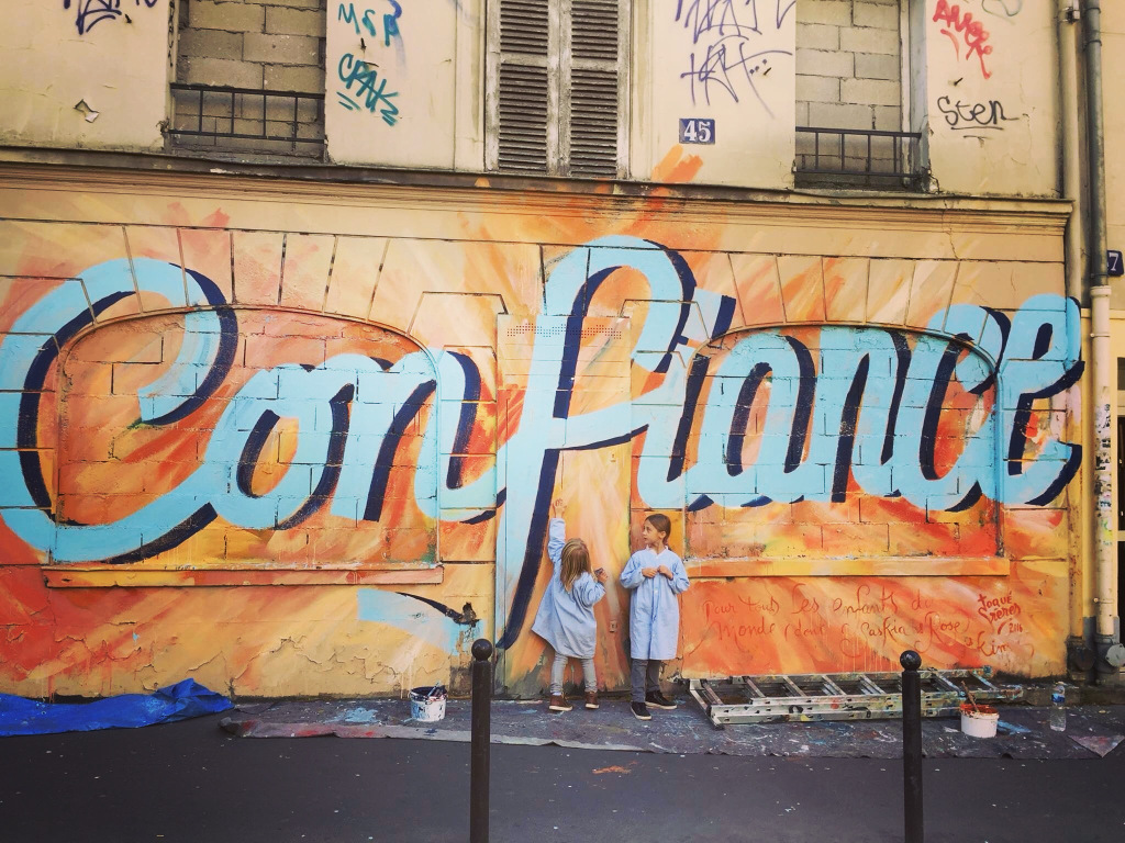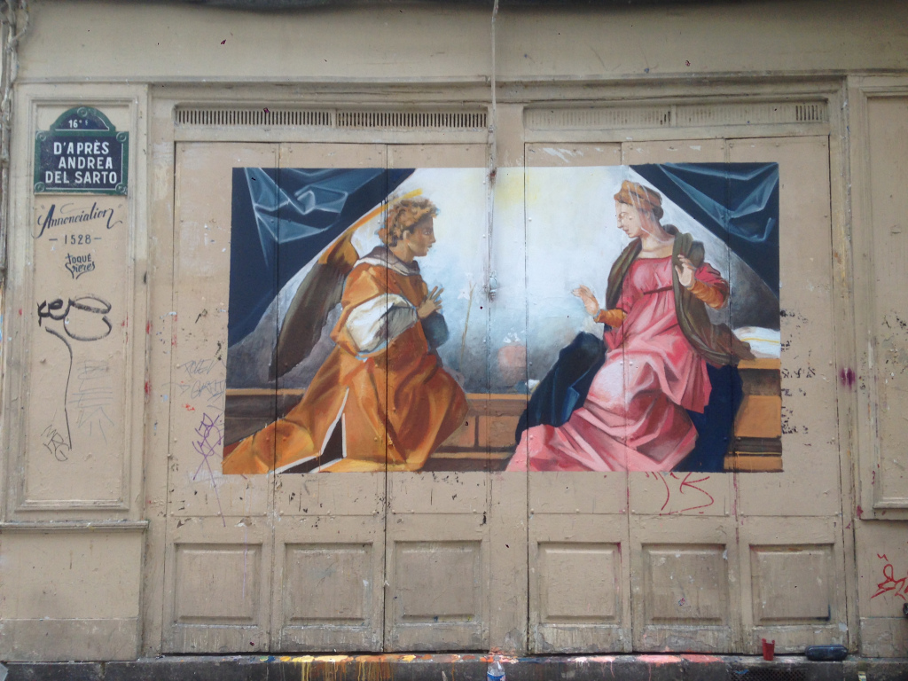 Ho iniziato 5 anni fa, con mio fratello. Le prime cose che abbiamo fatto erano delle copie d’opere d’arte. Per esempio, nel 16° arrondissement, c’è una strada intitolata al pittore fiorentino Andrea Del Sarto, l’abbiamo cambiata in “d’après Andrea Del Sarto” (tratto da Andrea Del Sarto ), dipingendo L’annunciazione della scala, che peró ora è stata cancellata, ma si puó vedere ancora su Instagram e sul nostro sito web. Ci piace molto anche lasciare in giro delle frasi, dei giochi di parole, delle citazioni di canzoni o dei proverbi un po’ riadattati. Sono frasi sempre positive, ispirate come “confiance” (fiducia), “l’amour gagne toujours” (l’amore vince sempre), o divertenti come “fait moi l’humour toute la nuit” (fammi l’umore tutta la notte).