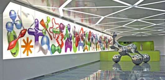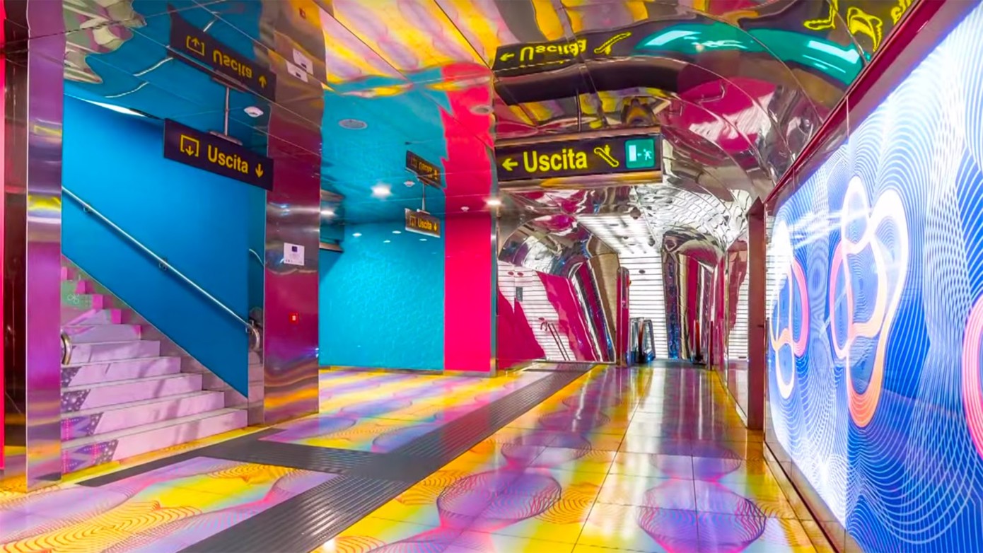 La stazione è suddivisa in due aree: una parte rappresenta l’era digitale con un’opera al centro chiamata Synapsy che ricorda il reticolo nucleare del cervello; la seconda parte è caratterizzata da pannelli coloratissimi che trasmettono calore e vivacità richiamando un po’ la cultura della città.
